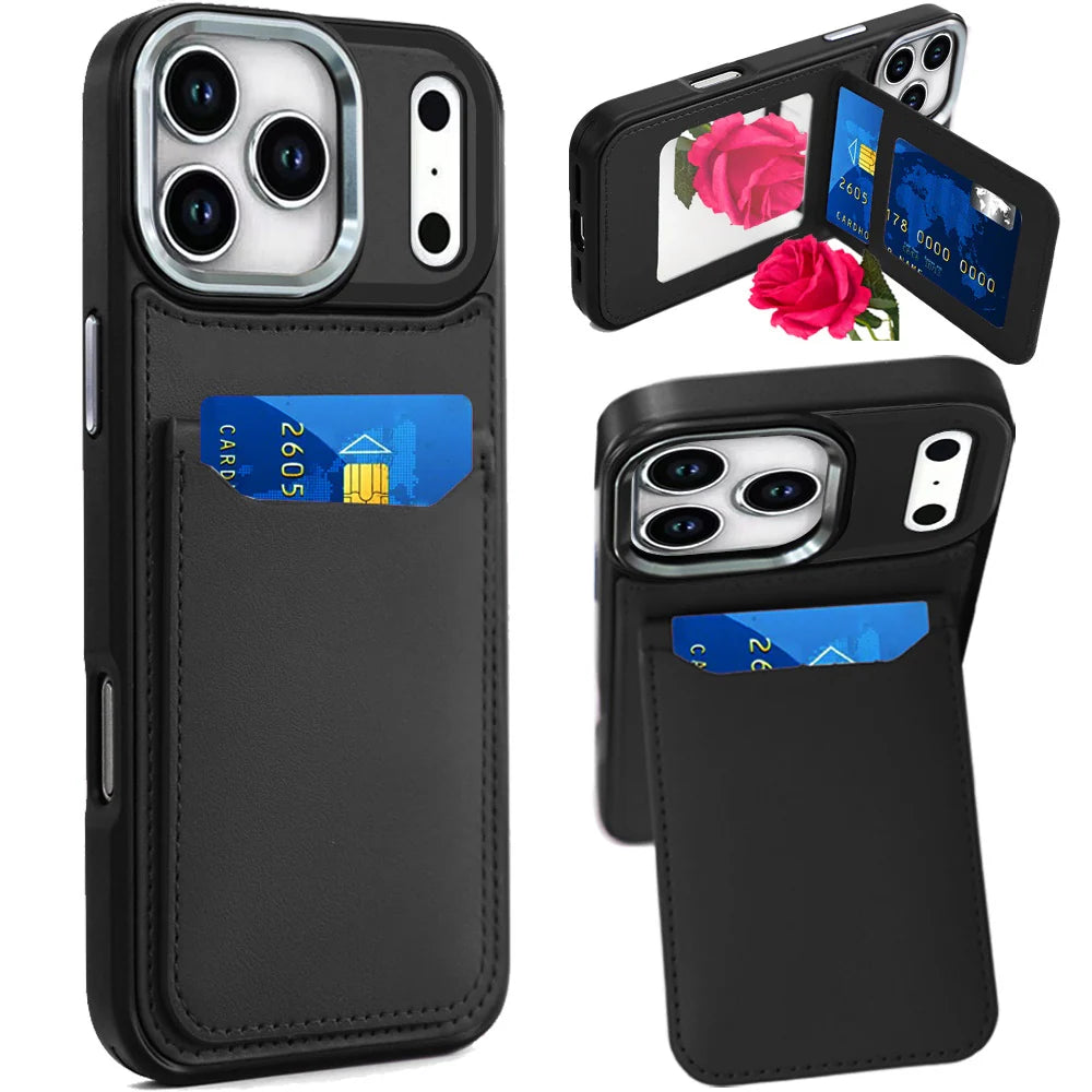 iPhone 17 Pro Max Leather Wallet Mirror Hybrid Case - Black